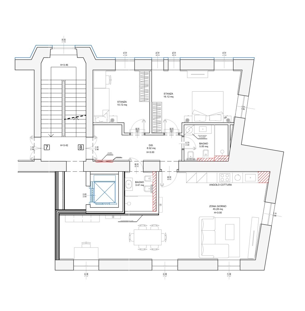 The mechanical systems will include a high-efficiency air-to-water heat pump inverter and condensing boiler for domestic hot water production. Heating will be provided by underfloor radiant panels, and cooling by ultra-quiet split systems. A photovoltaic solar system will be installed on the roof to significantly improve the building’s overall energy performance. Windows will be wood-framed with double glazing, white on the interior and walnut-finished on the exterior, combining durability with refined aesthetics.