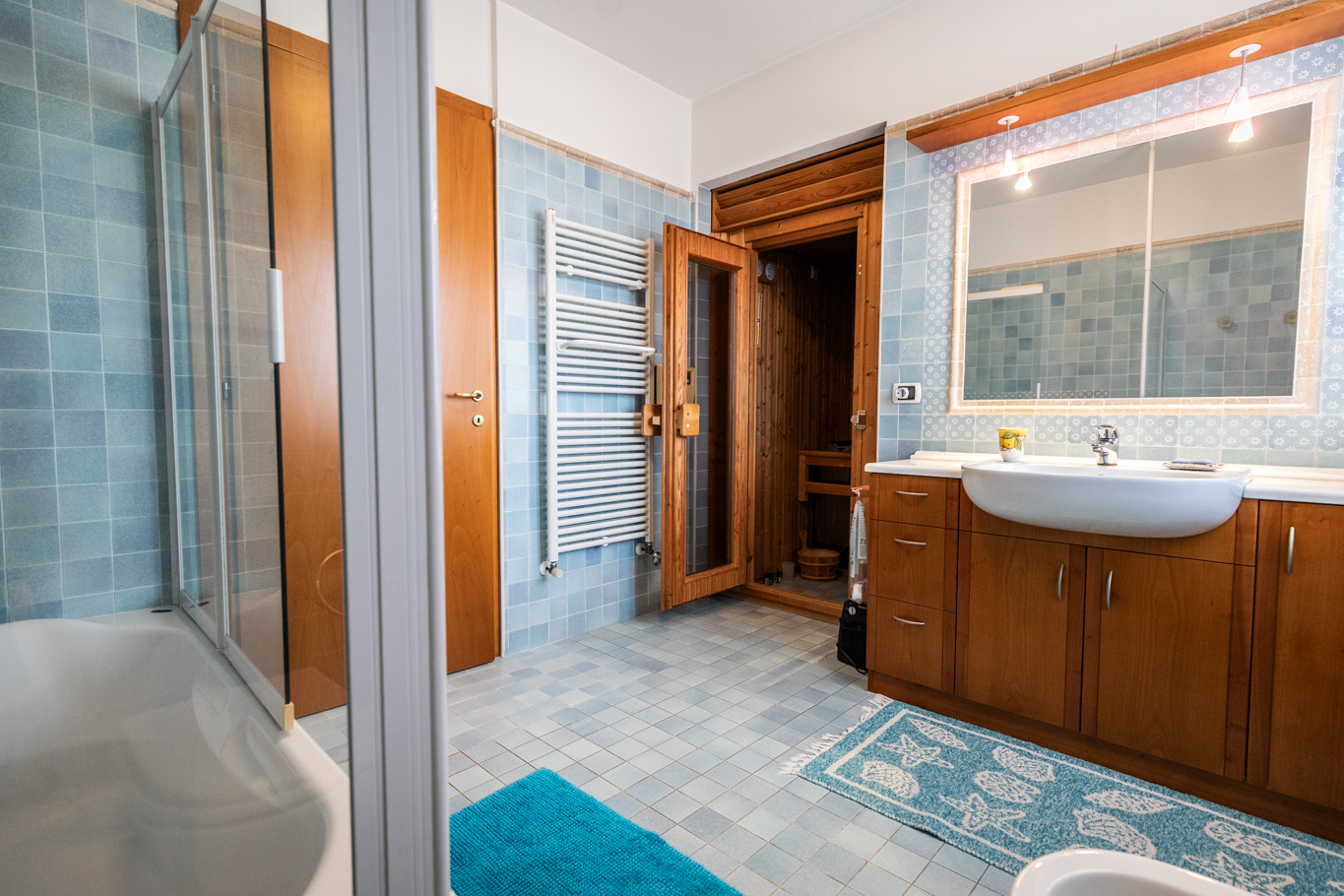 Al primo piano si sviluppano quattro spaziose camere da letto e uno studio che può essere utilizzato come area per lo smart working o zona giochi, oltre a due bagni moderni di cui uno dotato di una sauna elettrica tre persone con spazio interno utile di 1,20x 2,40 mt.